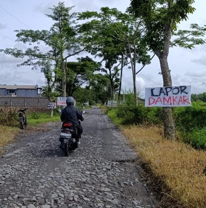 Samsiyah Aisyiah (40) warga setempat dikonfirmasi mengatakan, jalan rusak sudah sejak 2011 silam. Serangkaian protes warga juga tak pernah ditanggapi, hingga memicu inisiatif memasang baner di sepanjang jalan rusak. Sejumlah baner bertuliskan sindiran, lapor damkar, wellcome sewu watu, pajak podo nasib bedo (pajak sama nasib beda) dan masih banyak lainya ditujukan kepada pemerintah daerah.