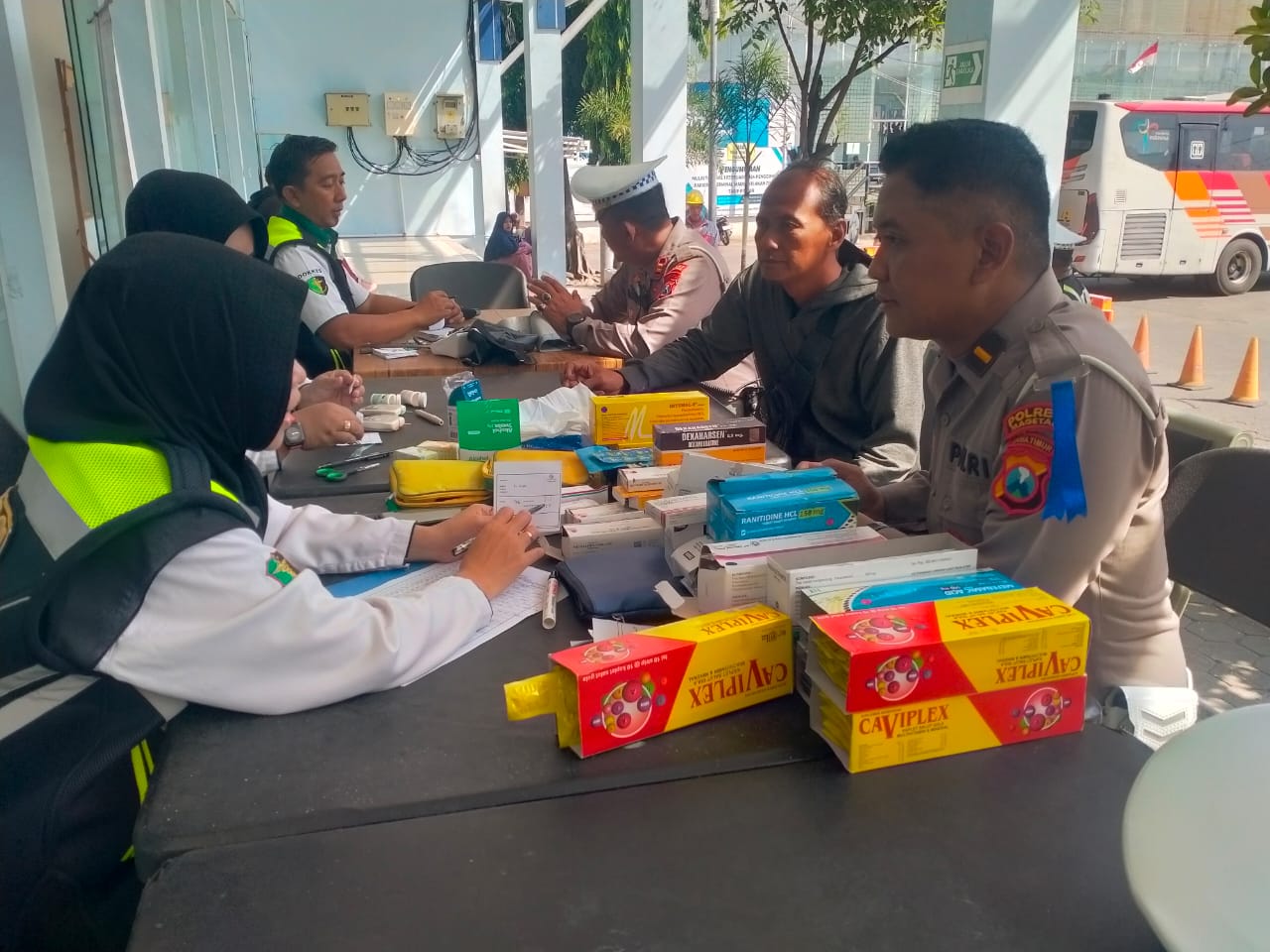 Selain pemeriksaan armada, petugas Dokkes Polres Magetan juga memberikan layanan pemeriksaan kesehatan gratis kepada para sopir dan penumpang. Pemeriksaan meliputi pengecekan tekanan darah, tensi, serta konsultasi kesehatan ringan.