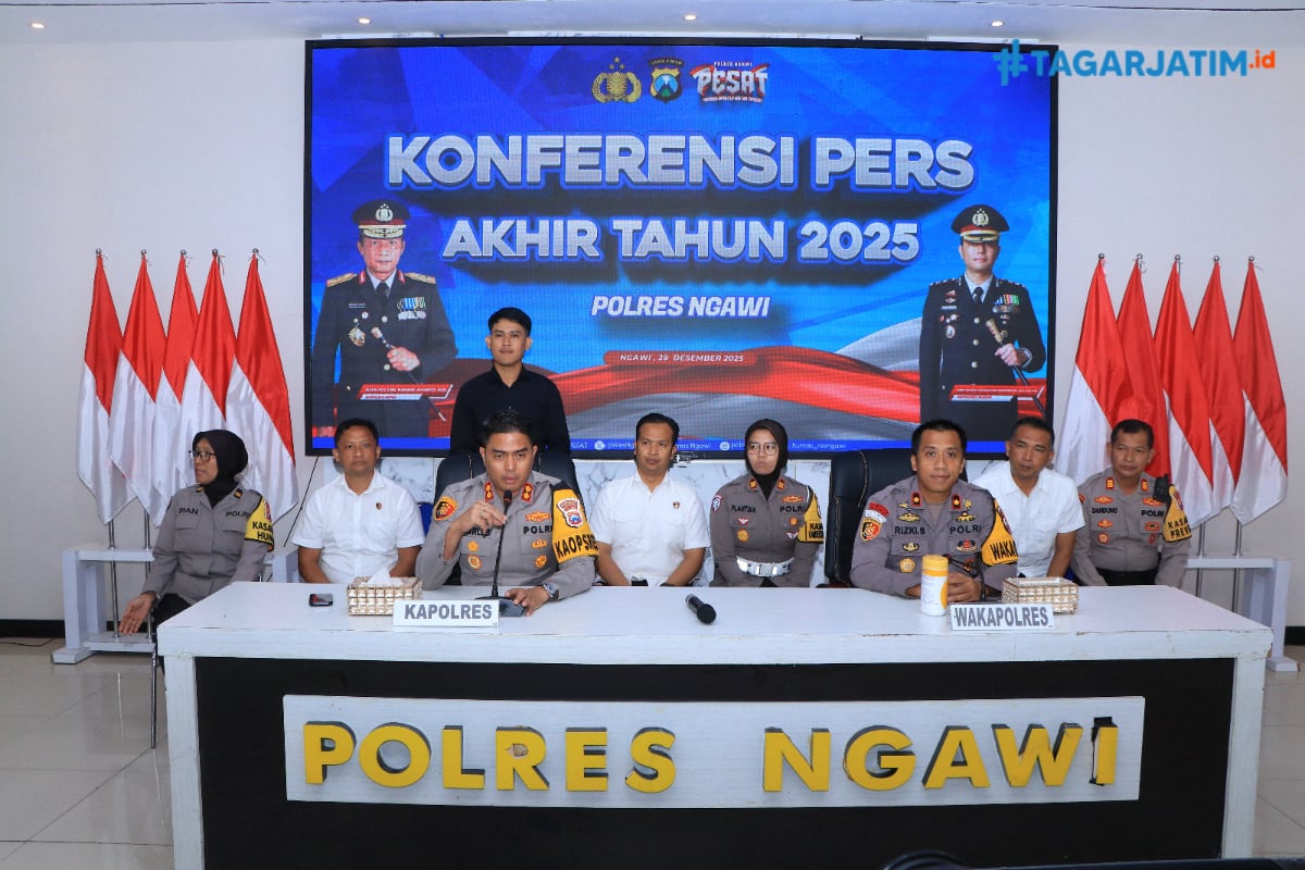 Ngawi, tagarjatim.id – Kapolres Ngawi AKBP Charles Pandapotan Tampubolon, memimpin langsung kegiatan Rilis Akhir Tahun 2025 di Ruang Guyup Kapolres Ngawi, pada Senin (29/12/2025).