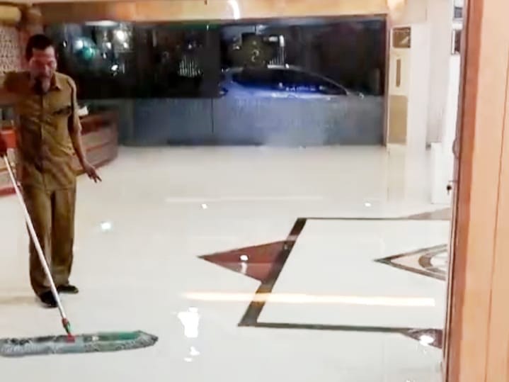 Genangan yang menumpuk di lantai dua kemudian merembes melalui tangga dan mengalir ke lantai satu. Petugas dan pegawai melakukan kerja bakti pada malam hari untuk membuang sisa genangan.