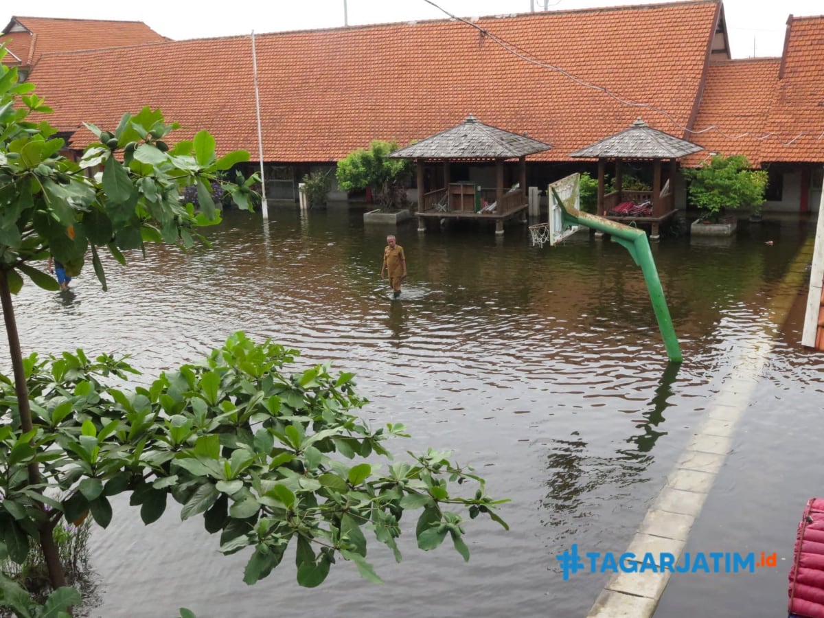 Sidoarjo, tagarjatim.id – Aktivitas belajar mengajar di hari pertama sekolah di SMP Negeri 2 Tanggulangin, Sidoarjo, terpaksa tidak berjalan normal akibat banjir yang menggenangi kawasan sekolah. Sebanyak tujuh ruang kelas terendam air setinggi 10 hingga 20 sentimeter, sehingga tidak dapat digunakan. Kondisi ini memaksa sebagian dari 645 siswa untuk melanjutkan pembelajaran secara daring.