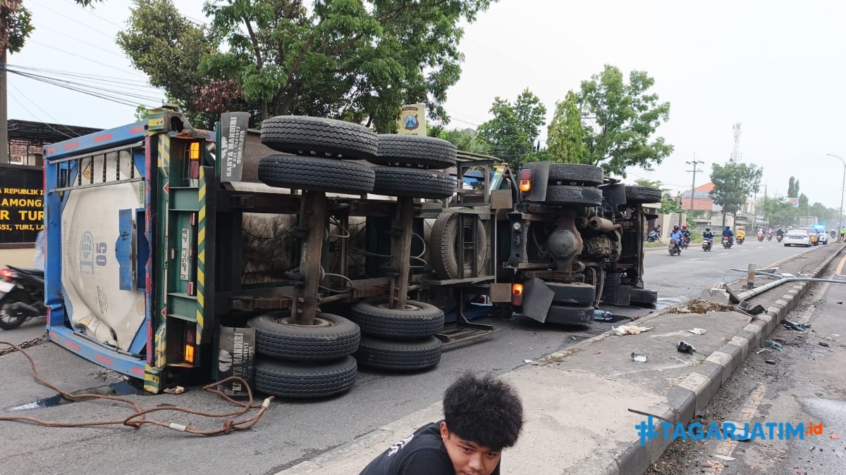 Lamongan, tagarjatim.id – Kecelakaan lalu lintas melibatkan dua kendaraan besar terjadi di jalur poros pantura lamongan, jawa timur, Kamis (8/1/2026) dini hari. Sebuah truk tangki bertabrakan dengan dump truk hingga menyebabkan salah satu kendaraan terguling dan mengakibatkan kemacetan panjang.